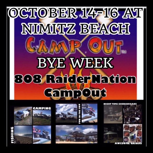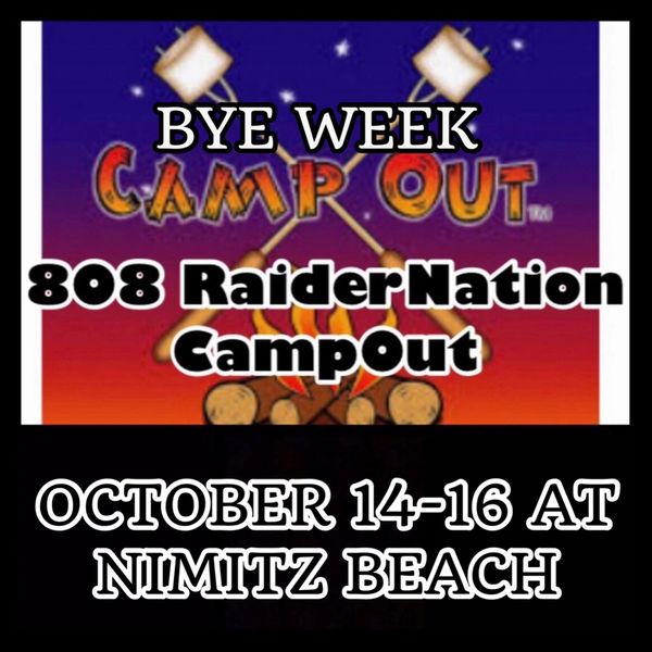 808 RaiderNation Bye Week CampOut. We will be having our annual Bye Week CampOut this October 14-16 at Nimitz Beach. All Raider Fans Welcomed for a weekend of fun in the sun and nights under the stars. All we ask for is a $20 donation from each family for the porta potty. Can’t wait to see you there! #808RaiderNation