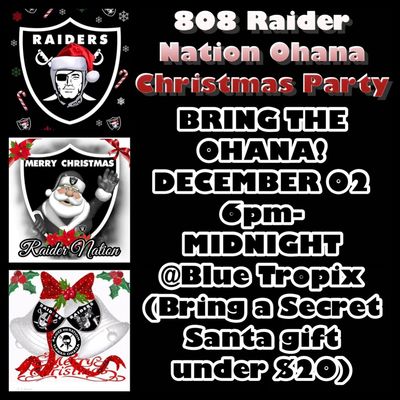 Hey Ohana it’s that time of year again! Our annual Christmas party is near! So bring the Ohana Friday December 2nd 6pm - midnight at Blue Tropix for a night of games, prizes and pictures with Raider Santa. Don’t forget to bring a Secret Santa gift under $20 to pass around. Also if you have a signature side dish you’d like to share, bring that too (pupus are appreciated) See you there for an Ohana Raider Christmas!